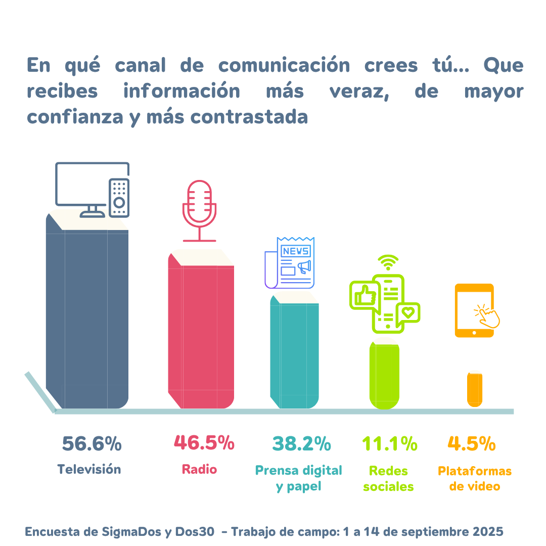 La televisión (56.6%), la radio (46.5%) y la prensa (38.2%) son los canales por los que la ciudadanía afirma recibir la información más veraz, confiable y contrastada, por delante de las redes sociales (11.1%) y las plataformas (4.5%).