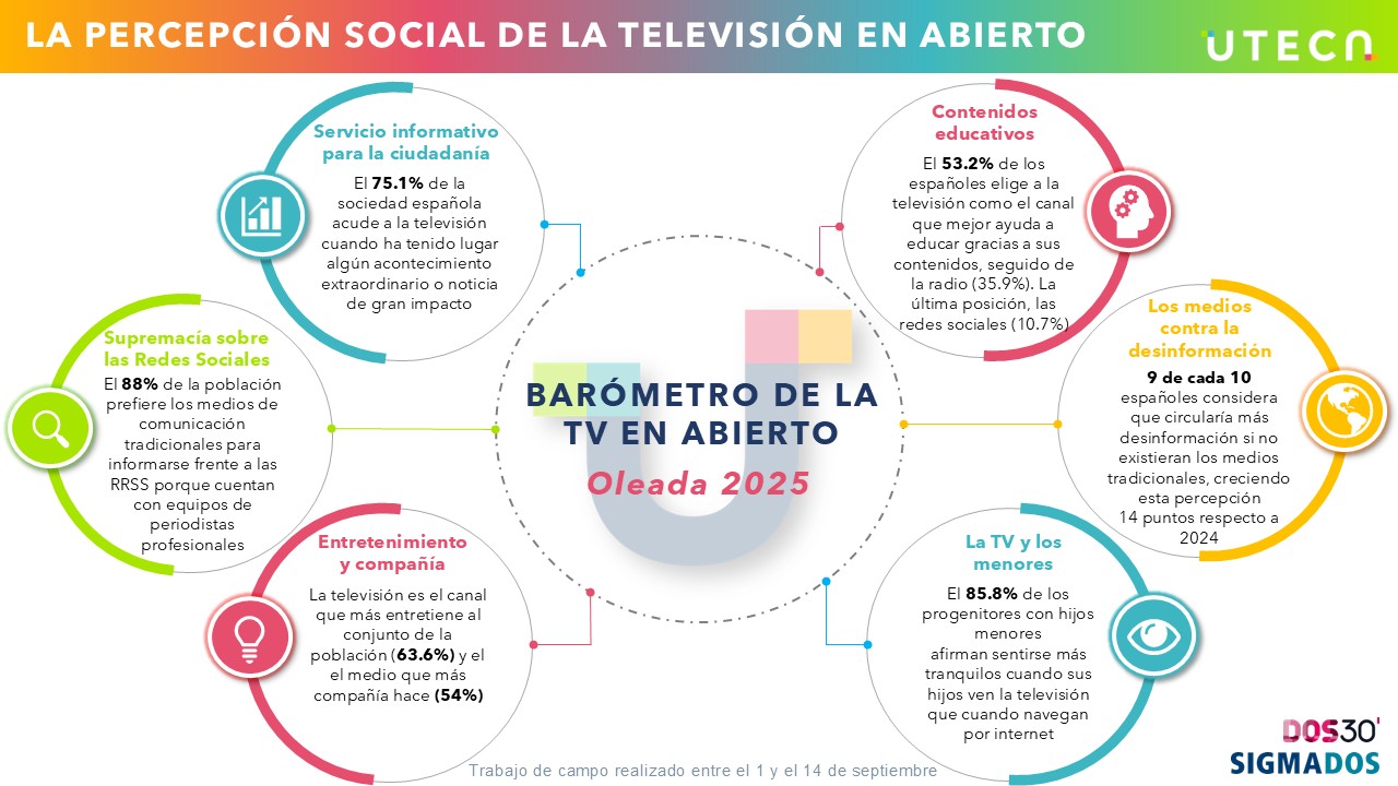 En la batalla contra la desinformación, los bulos y las “fake news”, la ciudadanía otorga un papel principal a la televisión, la radio y la prensa frente a las redes sociales. Así se desprende de los resultados del Barómetro sobre la percepción social de la Televisión en Abierto de UTECA correspondiente a 2025, realizado por la compañía demoscópica Sigma Dos y la consultora Dos 30 y difundido hoy, Día Mundial de la Televisión.