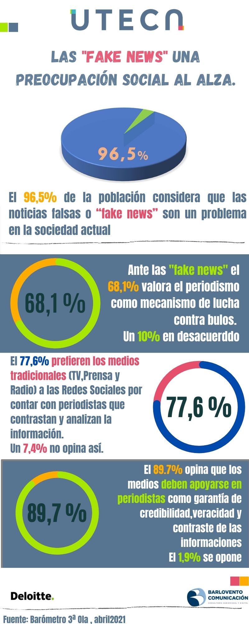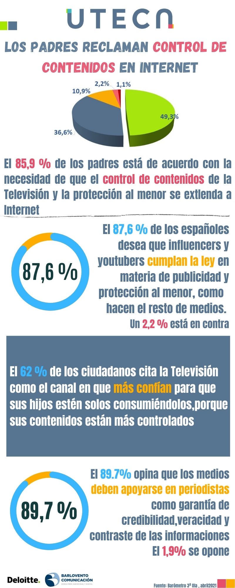 La primera ola del 2021 del Barómetro UTECA sobre la Percepción Social en torno a la Televisión en Abierto reafirma que es el medio preferido para informarse a diario (73,9%) y ante acontecimientos extraordinarios (79,1%). La fiabilidad y veracidad de sus informaciones alcanzan asimismo altas valoraciones, en un contexto de creciente preocupación por el auge de las “fake news”, que son un problema social para el 96,5% de los encuestados. Una ola más, 9 de cada ciudadanos considera que la TV en Abierto es un bien de interés general. Igualmente se mantienen la demanda social de una equiparación de las obligaciones de Redes Sociales y Plataformas de intercambio de vídeo a las que aplican sobre la Televisión en Abierto. Un 84,8% de los padres muestra su preocupación por la falta de control de los contenidos en internet.